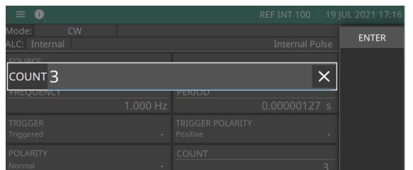 Press COUNT to type 1 (Single), 2 (Doublet), 3 (Triplet), or 4 (Quadruplet) pulse mode. Pulse COUNT of 3 (Triplet) is shown in Figure: Pulse Count. Press ENTER. The Internal Pulse Status display will show your selection.