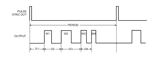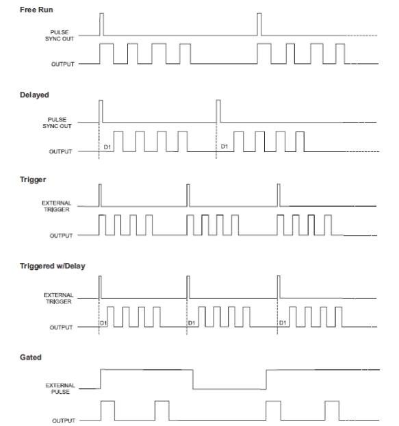 The pulse generator is triggered by an external trigger to produce Single, Doublet, Triplet, or Quadruplet pulse modulation waveforms delayed by pulse delay.