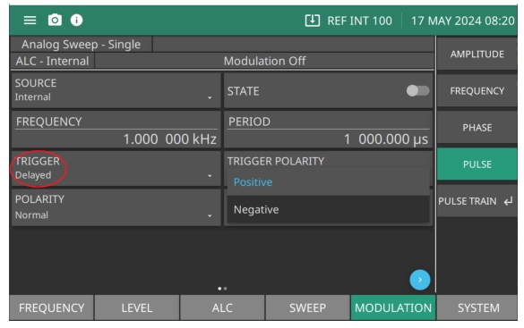 The pulse generator produces pulses at the internal PRF. Single, Doublet, Triplet, or Quadruplet pulse modulation waveforms at the internal pulse repetition rate. Pulse delay is not available in this trigger mode.