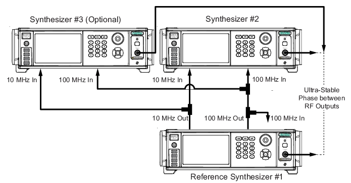 The 100 MHz loopback must be connected on the reference synthesizer as shown. The above adjustment of phase will work successfully when generators are set to the same frequency or frequencies that are harmonically related. The frequencies must be set in advance of making all the adjustments of phase and if the frequencies are subsequently changed, then the process of phase adjustment must be repeated.