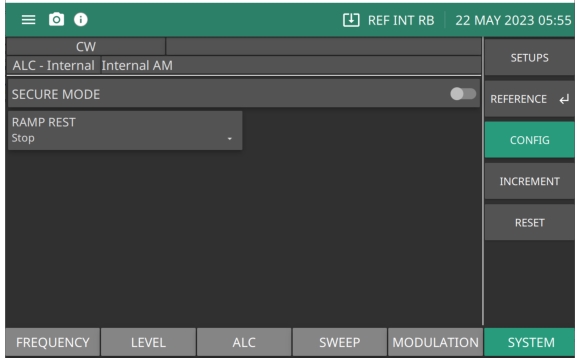 SECURE MODE Switch on to turn Secure Mode on. RAMP REST Sets the sweep rest point for the rear panel HORIZ OUT sweep ramp as follows: Start: Sets the sweep to rest at the bottom of the sweep ramp. Stop: Sets the sweep to rest at the top of the sweep ramp. |
