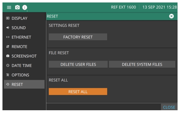 To access the RESET ALL menu shown in Figure: Reset Menu and set to factory default:
