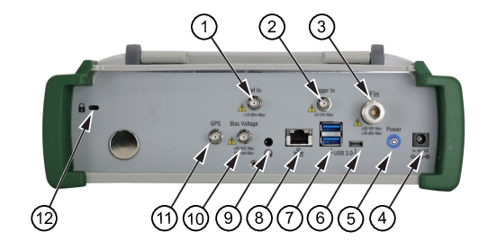 The MS2070A/80A Field Master uses the top connector panel to provide for all physical IO. The top panel uses a variety of connector types intended for their purpose.