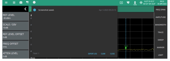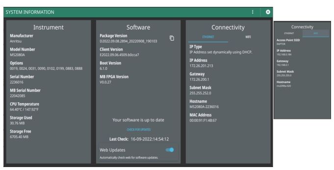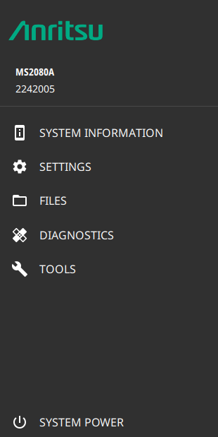 - | The System menu displays the instrument model and serial number. It consists of following menus: SYSTEM INFORMATION Opens the System Information panel showing instrument, software, and network connection details. SETTINGS Opens the Settings Menu, providing access to all system level settings and controls. FILES Opens File Management. Note that the file management menus are different from the right-side FILE menu. Use file management to organize, copy, and rename files. Use the right side FILE menu to save and recall measurement data, instrument setup files, or to save a screenshot. DIAGNOSTICS Opens Diagnostics. TOOLS Opens Tools Menu. SYSTEM POWER Opens a dialog to RESTART or POWER OFF the instrument. |