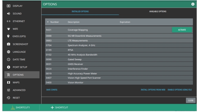 When time-limited options are installed but not yet active, press the ACTIVATE button to activate the option and begin the 90-day trial.