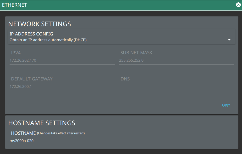 The instrument IP address and its HOSTNAME are set via the System menu (upper left corner) and accessing the ETHERNET or WIFI settings menu.
