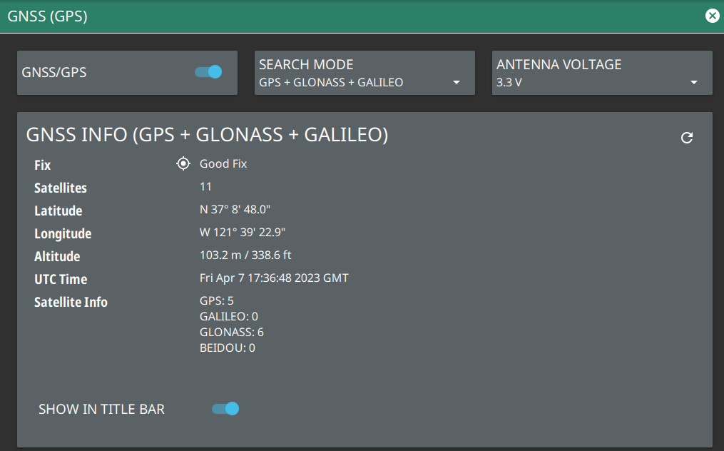 7. Toggling SHOW IN TITLE BAR shows the GNSS (GPS) coordinates in the title bar at the top of the display.