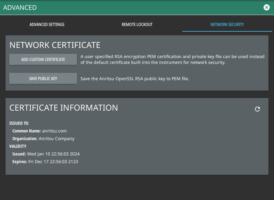 • Press SAVE PUBLIC KEY to save the Anritsu OpenSSL RSA public key to the PEM file.