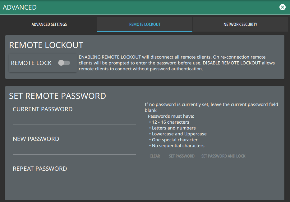 3. Select ADVANCED to access ADVANCED SETTINGS, REMOTE LOCKOUT AND NETWORK SECURITY TABS..
