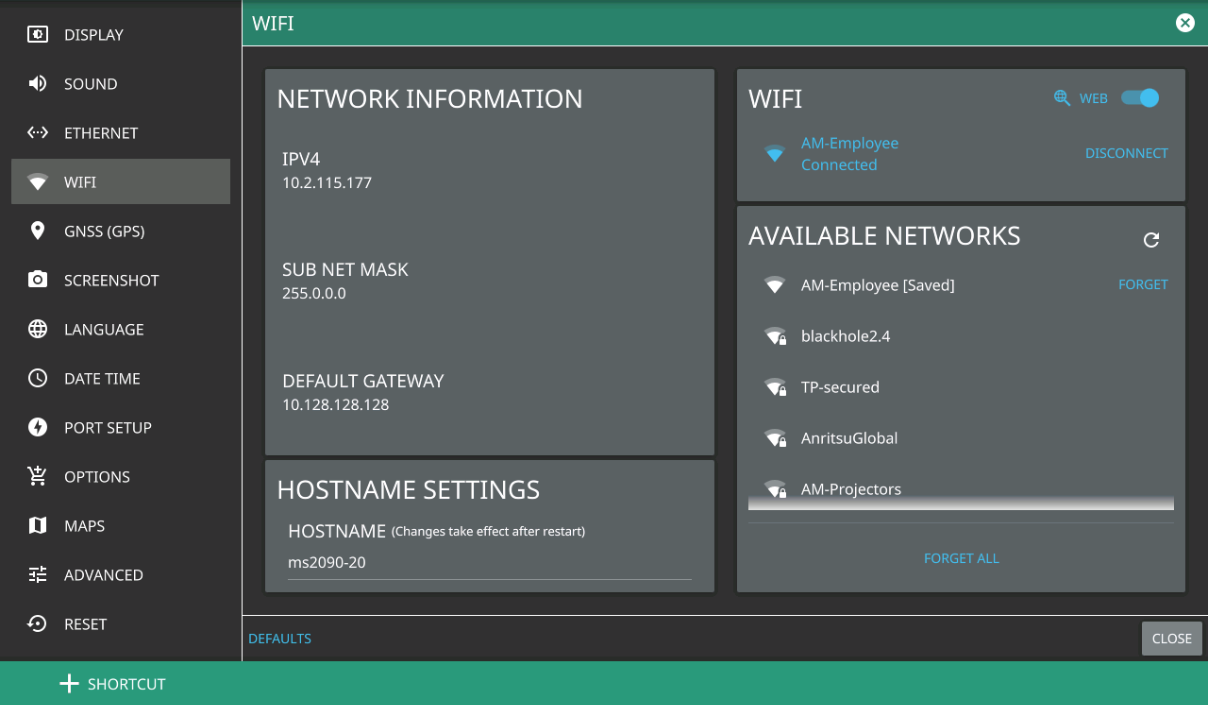2. Select SETTINGS to access the instrument settings menu, then select WIFI to display the current network settings (IP address, HOSTNAME, etc.).