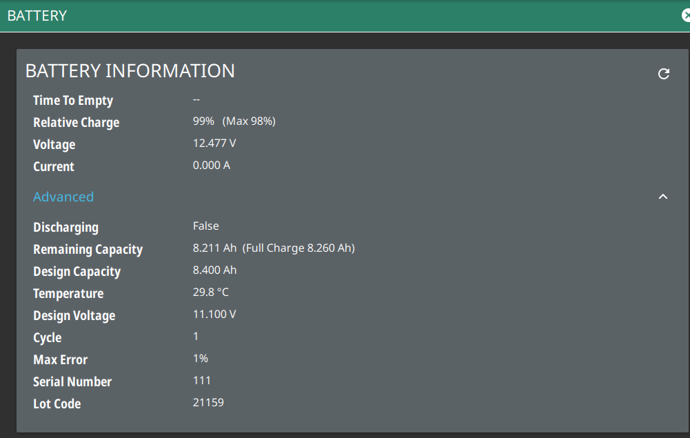 The battery information menu shows the available battery information. The relative charge indicates the charge level that the battery is capable of storing. The maximum charge shows the relative capacity of the battery compared to the design capacity. Advanced information can be expanded by touching ADVANCED.