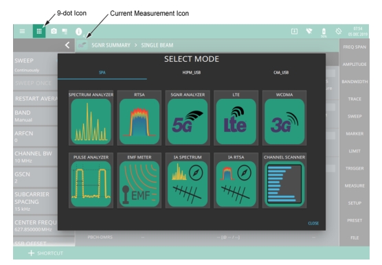 The instrument analyzers are selected from the 9-dot icon or the current measurement icon. To select an analyzer, press the 9-dot icon in the title bar or the current measurement icon to display the available analyzers, illustrated in