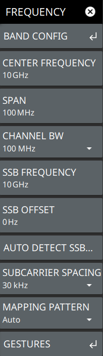 - ![]() | BAND CONFIG Opens the BAND CONFIG Menu. CENTER FREQUENCY Sets the center frequency of the measurement channel. Changing the center frequency sets the band to MANUAL. SPAN Sets the sweep frequency range. Pressing the plus (+) or minus (–) control increments the span value in a 1:2:5 sequence. The span can also be changed by pinching the trace in or out when gestures are not toggled off. CHANNEL BW Sets the measurement channel bandwidth. The available bandwidth settings depend on the selected band and bandwidth option installed in the instrument. Refer to “Options Settings” section in Instrument Overview chapter of the user guide. SSB FREQUENCY Sets the absolute SSB frequency. SSB OFFSET SSB is the synchronous signal block. The SSB offset sets the frequency offset between the SSB and the center frequency of the channel. Negative values result in an offset lower than the center frequency. Positive values result in an offset higher than the center frequency. AUTO DETECT SSB Auto detects the center position of the SSB according to the 3GPP raster of GSCN values. If the search is successful, the correct SSB OFFSET is automatically applied and the signal should synchronize for demodulation. See Figure: AUTO DETECT SSB Dialogs (5GNR Measurements). SUBCARRIER SPACING Sets the subcarrier spacing. The available input range is dependent on the selected band. MAPPING PATTERN Select which mapping pattern: P1 for the 3GPP Phase 1 standard, March 2018. P2 for the 3GPP Phase 2 standard, September 2018. Auto selects the most recent standard. GESTURES Opens the GESTURES Menu. Not available in 5GNR Summary, OTA (Multi PCI), Carrier Aggregation and Constellation measurements. |