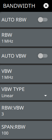 When toggle on, the instrument selects the resolution bandwidth based on the current span width. The ratio of span width to RBW can be specified using the SPAN:RBW button. When toggled off (manual), the RBW label at the left edge of the X-axis will be preceded by the “#” symbol.