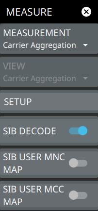 SETUP Opens one of the measurement SETUP menus. The 5GNR SETUP menus can be access directly via the SETUP or MEASURE menus after the desired measurement has been selected. The setup menu depends on the current measurement and view selected. SIB DECODE Enables display of Mobile Network Code (MNC) and Mobile Country Code (MCC) information. Refer to SIB Measurement. SIB USER MNC MAP Enables or disables custom user configuration of MNC to mobile network names mapping. Refer to SIB Measurement. SIB USER MCC MAP Enables or disables custom user configuration of MCC to mobile network names mapping. Refer to SIB Measurement. |