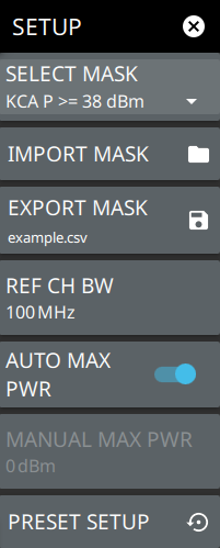 ![]() | SELECT MASK Selects the desired upper or lower emission mask. Choose the desired mask from the list. IMPORT MASK Used to import a custom user mask. EXPORT MASK Exports an example user mask as a comma separated value file (see Example Custom Signal Emission Mask) or exports the currently selected custom mask. REF CH BW Sets the reference channel bandwidth for the measurement. AUTO MAX PWR Toggles automatic max power. Some segments in the mask are dependent on the main channel power. Enabling this automatically calculates the reference channel power by measuring the channel power of the center channel bandwidth. When disabled, the reference power must be entered manually below. MANUAL MAX PWR Used to manually enter the reference channel power for masks that have limits dependent on main channel power. PRESET SETUP Presets all values on the SETUP menu to default values. |