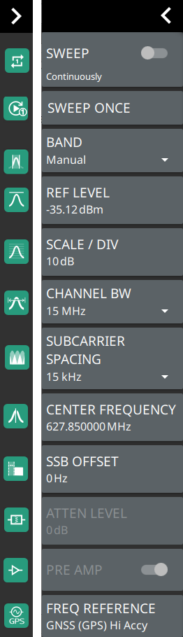 ![]() | SWEEP Toggles the current sweep setting between continuously or sweep once. Refer to Setting Sweep Parameters. SWEEP ONCE When sweep is set to single sweep, SWEEP ONCE updates the measurement display. Data continues to be captured in the background. BAND Select MANUAL, GLOBAL ALL or one of the predefined bands. Selecting MANUAL hides ARFCN and GSCN settings. Selecting a predefined band or GLOBAL ALL activates ARFCN and GSCN settings. REF LEVEL Sets the reference level of the top graticule line in the selected units. If the reference level offset is not zero, OFFSET REF LEVEL is displayed at this location. Refer to Setting Amplitude Parameters. SCALE/DIV Sets the graticule scale/division for log-based units. This setting does not apply to linear units. CHANNEL BW Sets the measurement channel bandwidth. The available bandwidth settings depend on the selected band and bandwidth option installed in the instrument. Refer to “Options Settings” section in Instrument Overview chapter of user guide. SUBCARRIER SPACING Sets the subcarrier spacing. The available input range is dependent on the selected band. CENTER FREQUENCY When the band is set to MANUAL, sets the center frequency of the measurement channel. Changing the center frequency sets the band to MANUAL. SSB OFFSET SSB is the Synchronous Signal Block. The SSB Offset sets the frequency offset between the SSB and the overall resource block. ATTEN LEVEL When auto attenuation is off, sets input attenuation. PRE AMP Toggles the low-noise front-end preamplifier on or off. Refer to Setting Amplitude Parameters. TRACES Displays the current status of up to six traces in the status panel. The trace card includes the trace number, type, mode, and detector type. The active trace will show a highlighted background with the mode and detector type restated under the table. Selecting a trace in the status panel activates the pressed trace and opens the TRACE menu, allowing you to select and set up an individual trace as desired. Refer to Setting Trace Parameters. FREQ REFERENCE Indicates the current frequency reference source of Internal High Accuracy (used after GPS has lost sync, but while the internal clock still has good GPS reference), Internal Standard Accuracy, External, or GNSS (GPS) Hi Accy (requires GPS). The instrument automatically selects the frequency reference in the following order of priority: external, GPS, then the internal time base. |