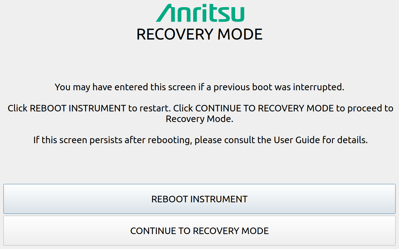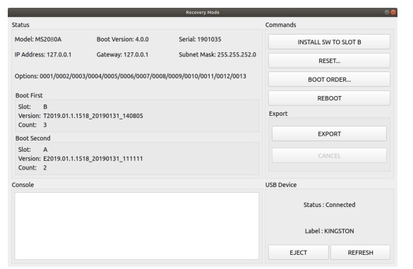 Status Shows the Model, Boot Version, Serial Number of the MS2070A/80A, IP Address, Gateway, Subnet Mask. Options Shows the Options currently installed. Boot First Shows the Slot, Version, and Count in the Boot First position. Boot Second Shows the Slot, Version, and Count in the Boot Second position. Console Provides a readout of the reboot activity. Commands Choose the command method to restart the instrument: • INSTALL SOFTWARE TO SLOT B: Indicates which slot will be overwritten as described in Install SW to SLOT X • RESET: Provides the RESET dialog as shown in Reset. • BOOT ORDER: Provides the Boot Order dialog as shown in Boot Order. • REBOOT: Reboots the instrument. Export Select EXPORT to save all internal user files and logs to a USB device. Select CANCEL to cancel the export. The saved files can be copied back to internal memory by using the file management menus. USB Device This section provides: • Status: The USB memory device is connected or unconnected. • Label: The Manufacturer of the USB memory device. • EJECT: Select to eject and remove the USB memory device. • REFRESH: Select to reconnect to the USB memory device. |
