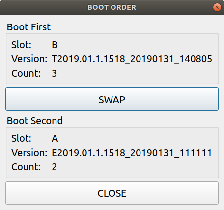 - ![]() | Boot First Provides the first boot version to boot. • Slot: Provides the slot designated location. • Version: Provides the boot version number. • Count: Boot attempts with this version. SWAP Swap Slot A and Slot B in the boot sequence. Boot Second Provides the first boot version to boot. • Slot: Provides the slot designated location. • Version: Provides the boot version number. • Count: Boot attempts with this version. Close Closes the BOOT ORDER dialog. |