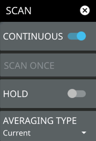 ![]() | CONTINOUS Turn this toggle on to enable continuous scanning of all the channels. SCAN ONCE Selects the measurement view as either bar chart or strip chart. HOLD Selects the measurement view as either bar chart or strip chart. AVERAGING TYPE Sets the channel averaging type to indicate the field for determining the average against. • Current: Sets the channel averaging type as the current channel power value. • Max: Sets the channel averaging type with the maximum channel power value. • Min: Sets the channel averaging type with the minimum channel power value. • Average: Sets the channel averaging type with the average channel power value. • Rolling Max: Sets the channel averaging type with the rolling maximum channel power value. • Rolling Min: Sets the channel averaging type with the rolling minimum channel power value. • Rolling Average: Sets the channel averaging type with the rolling average channel power value. |