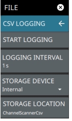 Selects the storage device to save the channel scanner log files.The log files can be stored either internally in the instrument or on the external USB memory device.