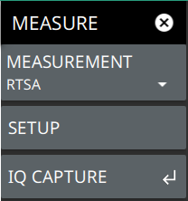 ![]() | MEASUREMENT Selects the desired measurement type from the following list: • RTSA: Displays the frequency domain spectrum measurement. • AM/FM Audio: Available when Option 24 or Option 509 is installed. The AM/FM Audio provides audio demodulation capability. Refer to AM/FM Audio (Requires Option 24 or Option 509) and AM/FM Modulation Measurement (Option 509). • PIM/Interference: Available when Option 24 is installed. The input parameters and channel measurements tables, max/min level lines, and total channel power signal indicator are added to the measurement display. Refer to Interference Finder (Option 24). • Interference Map: This technique is used to geo-locate the interfering signals that may be from a few hundred yards to a few miles away, with respect to user’s current location. Refer to Interference Map. • Interference Polar: This technique is used to geo-locate the polar plot of the interfering signals that may be from a few hundred yards to a few miles away, with respect to user’s current location. Refer to Interference Polar. SETUP IQ CAPTURE Refer to the IQ Capture/Streaming Measurement Guide for discussion of IQ Capture and Streaming, PN: 10580-00490. |