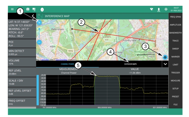 1. The map zoom tool is used to increase (+) or decrease (-) zoom level. You can also drag the zoom level indicator up or down, or you can pinch to change zoom level. 2. Triangulation of all the three Interference signals. 3. Recentering tool to center map on current GPS position. A GPS is required for this icon to appears. 4. Select Outdoor Maps to view the list of saved maps or to create a new map using Map tool. 5. Max channel power. |