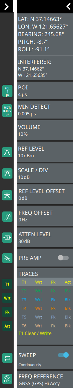 Pressing editable parameters opens the associated menu with a keypad that allows you to conveniently change the parameter value. These are the same settings found in the right side menus. LATITUDE Shows the latitude coordinate of the interferer LONGITUDE Shows the longitude coordinate of the interferer. BEARING Direction the MA2700A is pointing (shown in red). PITCH (vertical level) Indicates the front-to-back orientation. ROLL (horizontal level) Indicates the side-to-side orientation. INTERFERER Shows the latitude and longitude coordinates of the interferer. POI Probability of Intercept (POI) is the minimum signal duration that the analyzer can detect at full amplitude with 100% probability. MIN DETECT The minimum detection is the minimum signal duration that the analyzer can detect. VOLUME Sets the audio output volume. REF LEVEL Sets the reference level of the top graticule line in the selected units. If the reference level offset is not zero, OFFSET REF LEVEL is displayed at this location. Refer to Setting Amplitude Parameters. SCALE/DIV Sets the graticule scale/division for log-based units. This setting does not apply to linear units. REF LEVEL OFFSET Sets the reference level offset in dB units. This setting can compensate for the presence of external input attenuation or gain. FREQ OFFSET Accounts for frequency conversions outside of the analyzer. Refer to Setting Frequency Parameters. ATTEN LEVEL When auto attenuation is off, sets input attenuation. PRE AMP Toggles the low-noise front-end preamplifier on or off. Refer to Setting Amplitude Parameters. TRACES Displays the current status of up to six traces or cursors in a quick-view summary. When the measurement view is set to IA RTSA mode trace information is displayed in this area. The summary information includes the trace number, type, mode, and detector type. The active trace will show a highlighted background with the mode and detector type restated under the table. Pressing a trace in the summary panel activates the pressed trace or cursor and opens the TRACE menu, allowing you to select and set up an individual trace or cursor as desired. Refer to Setting Trace and Cursor Parameters. Note that cursor parameters don’t apply to IA RTSA application because there is not spectrogram view. SWEEP Toggles the current sweep setting between continuously or sweep once. Refer to Setting Sweep Parameters. FREQ REFERENCE Indicates the current frequency reference source of Internal High Accuracy (used after GPS has lost sync, but while the internal clock still has good GPS reference), Internal Standard Accuracy, External, or GNSS (GPS) Hi Accuracy (requires GPS). The instrument automatically selects the frequency reference in the following order of priority: external, GPS, then the internal time base. |