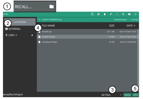 ![]() | QUICK SAVE saves a setup file immediately with the name shown in the button. The number in the name is incremented automatically so that the new name is ready for the next setup file to be saved. SAVE AS Opens the Save dialog to manually enter a file location, enter a file name, and to set the file type to be saved. Depending on the selected measurement, you can save the following: • Setup: Saves the current instrument setup (stp file type). • Trace: Saves the measurement point (trace) data and the current instrument setup (fmiart file type). • Trace CSV: Saves the visible trace point data in comma separated value format (csv file type). This format is useful for further analysis using other software tools. • Limit: Saves the current limit line point data (lim file type). • Screenshot: Saves a screenshot of the current measurement (png file type). • Trace + Screenshot: Saves both the current measurement and screenshot files (both fmiart and png file types). RECALL Opens the Recall File dialog to retrieve a file from a desired location. Only supported files will be displayed depending on the currently set measurement. When trace data is recalled, the instrument will change the settings to match the settings of the saved trace. The data will be recalled to the appropriate trace. That trace will be in a Hold mode. To exit the recalled data, simply change the trace mode back to Active. SAVE ON EVENT: Opens the SAVE ON EVENT Menu. This feature is not available in the 5GNR/LTE analyzer. BROWSE FILES Opens File Management. Refer to instrument user guide for detailed information. |