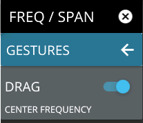 - ![]() | DRAG Toggles the touchscreen drag feature on or off. When toggled off, the center frequency will not change when dragging the spectrum display. This can be useful when dragging markers. Note that the Drag feature can also be toggled on/off by touching the locks under the display. |
