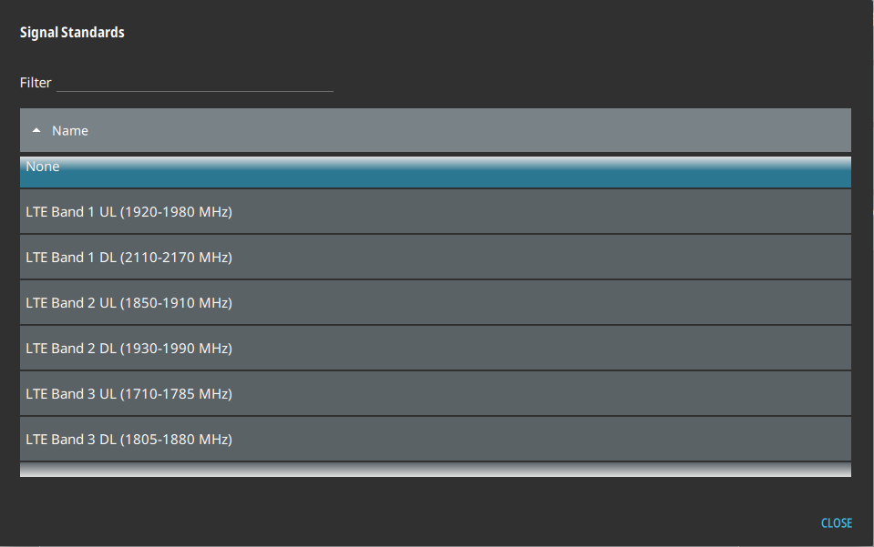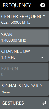 - ![]() | CENTER FREQUENCY Sets the center frequency of the measurement channel. SPAN Sets the current frequency span. CHANNEL BW Sets the measurement channel bandwidth. The available bandwidth settings depend on the selected band and bandwidth option installed in the instrument. EARFCN E-UTRA Absolute Radio Frequency Channel Number (EARFCN) uniquely identifies the LTE band and carrier frequency. Sets the uplink and downlink carrier frequencies, which range from 0 to 65535. SIGNAL STANDARD Opens the SIGNAL STANDARDS Dialog. This dialog provides a selection list of predefined LTE signal standards. Selecting an LTE signal standard configures the instrument for measurements in the selected band. GESTURES Opens the GESTURES Menu. Not shown in LTE Modulation measurements. |