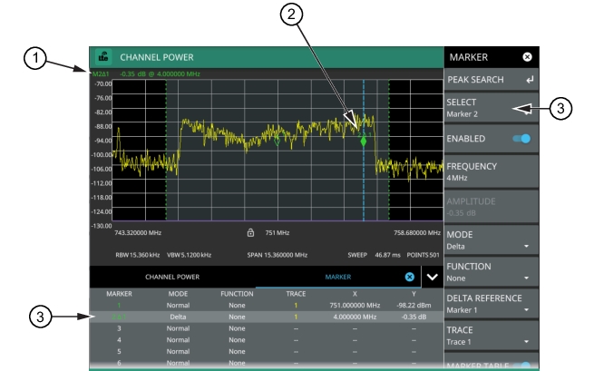 1. Normal spectrum view marker information display. 2. Marker located on trace. The active marker is indicated with solid green fill, other markers will show with a hollow fill, fixed markers show as a green X. 3. Selected marker in the MARKER menu and in the marker table. The marker table shows all of the marker parameters and measurement values. You can edit marker parameters from the marker table as well as from the MARKER menu. |