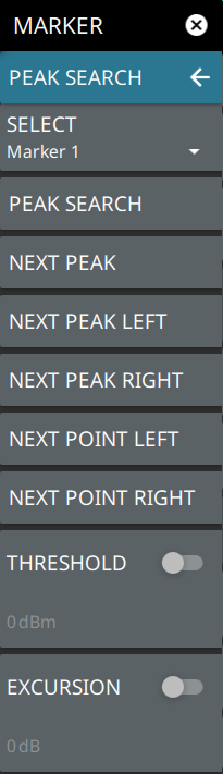 ![]() | PEAK SEARCH Opens the MARKER PEAK SEARCH Menu. SELECT Turns on the selected marker if it is off or makes it the active marker if it is already turned on. Pressing the MARKER menu button for the first time will turn on Marker 1 as a normal marker at the center frequency, and open the MARKER menu. Pressing the MARKER menu button thereafter opens the MARKER menu to the current active marker, which is displayed in the upper left-hand corner of the screen. When a marker is turned on, it is a normal marker positioned at the center frequency of the selected trace. ENABLED: Enables the selected marker. FREQUENCY Displays the marker frequency. For delta markers, the frequency is relative to the reference marker. Change the marker frequency by pressing on the marker and dragging it to the desired location. You can also change the marker frequency by touching the value to open the keypad. AMPLITUDE Displays the current marker amplitude. If the marker is a fixed marker, the amplitude value can be changed by dragging the marker to the desired location or by directly entering the amplitude. MODE Select marker preference: • Normal: A Normal marker is also known as a tracking marker. The frequency is fixed but the amplitude value varies from sweep to sweep. • Delta (Δ): A Delta (Δ) marker displays the delta frequency and amplitude between itself and a reference marker. If Marker 1 is selected to be a Delta marker, then Marker 2 is turned on as a reference marker for Marker 1 and it becomes a Fixed marker at the same location. The reference marker can then be switched to a Normal marker if desired. • Fixed: A Fixed marker has a fixed amplitude and fixed frequency, which are defined by the user and not related to the trace or sweep data. FUNCTION Sets the function of the currently selected marker to None or Noise. For more information about using marker functions, refer to Marker Functions. DELTA REFERENCE Selects the reference marker for a delta marker. A delta marker cannot be its own reference. Only Fixed and Normal markers may be used as a reference for Delta markers. TRACE Selects the trace number to which the marker is currently attached. MARKER TABLE Toggle on or off the marker table displayed below the screen. Refer to Marker Table. CENTER ON MARKER Sets the center frequency to the currently active marker’s frequency value. REF LVL TO MARKER Sets the reference level to the currently active marker’s amplitude value. ALL MARKERS OFF Turns all markers off, but markers will retain their last frequency position once re-enabled. PRESET MARKERS: Presets marker selections to default values. |