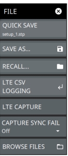 ![]() | QUICK SAVE saves a setup file immediately with the name shown in the button. The number in the name is incremented automatically so that the new name is ready for the next setup file to be saved. SAVE AS Opens the Save dialog to manually enter a file location, enter a file name, and to set the file type to be saved. Depending on the selected measurement, you can save the following: • Setup: Saves the current instrument setup (stp file type). • Trace: Saves the measurement point (trace) data and the current instrument setup (fmlte and fmspa file type). • Trace CSV: Saves the visible trace point data in comma separated value format (csv file type). This format is useful for further analysis using other software tools. • Screenshot: Saves a screenshot of the current measurement (png file type). • Trace + Screenshot: Saves both the current measurement and screenshot files (both fmlte and png file types). • KML: Saves measurement data in Keyhole Markup Language format, including the instrument model number, installed options, sample data with GNSS (GPS) coordinates, if GNSS (GPS) Option 31 is installed. (Option 431, Coverage Mapping only (Outdoor Map)). Note that the saved data is cumulative of all data points on the map or measurements since the map points were last cleared. RECALL Opens the Recall File dialog to retrieve a file from a desired location. LTE CSV LOGGING Opens LTE CSV LOGGING Menu LTE CAPTURE Initiates a digitized LTE data capture at the selected bandwidth. LTE captures are saved to the internal storage space in the captures folder (bin file type). This feature is meant to help identify LTE signal characteristics during early development. CAPTURE SYNC FAIL Automatically initiates a digitized LTE data capture when synchronization fails. The setting can be configured to capture just a single event or repeat events. LTE captures are saved to the internal storage space. BROWSE FILES Refer to “File Management” section of Instrument Overview chapter of the user guide. |