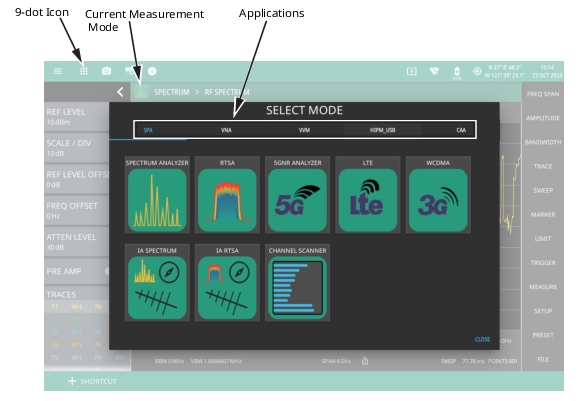The instrument applications are selected from the 9-dot icon or the current measurement icon. To select an application, press the 9-dot icon in the title bar or the current measurement icon to display the available