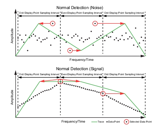 ![]() | TYPE Selects one of the following types of traces: • Clear/Write: Clears the trace after each sweep is complete and writes a new trace. • Min Hold: Represents the minimum value since sweeping began. The number of sweeps is displayed in the status panel TRACES table. • Max Hold: Represents the maximum value since sweeping began. The number of sweeps is displayed in the status panel TRACES table. • Average: The exponential average of all N traces, where N is the AVERAGES number set below. The number of sweeps is displayed in the status panel TRACES table. • Rolling Max Hold: Is the maximum rolling average value of the last N traces, where N is the AVERAGES number set below. The number of sweeps is displayed in the status panel TRACES table. • Rolling Min Hold: Is the minimum value of the last N traces, where N is the AVERAGES number set below. The number of sweeps is displayed in the status panel TRACES table. • Rolling Average: Is the rolling average of the last N traces, where N is the AVERAGES number set below. The number of sweeps is displayed in the status panel TRACES table. DETECTOR TYPE Selects one of the available detector types. Several detection methods tailor the function of the instrument to meet specific measurement requirements. There are often more measurement points across the screen than display points. The various detection methods are different ways of showing each display point (see Trace Detector Types). • Peak: Shows the maximum amplitude of sampled data for each display point, assuring that a narrow peak is not missed. • Negative: Shows the minimum amplitude of sampled data for each display point. This method is also useful when measuring modulated signals to see if some frequencies are not being used. • Sample: Shows the transient amplitude of the center of sampled data for each display point. This method is useful when measuring low-level signals and noise measurements. • Normal: Normal detector type also referred to as Rosenfell, shows the random noise than positive peak and avoids the missed-signal problem of the Sample Mode. Should the signal both rise and fall within the bucket interval, then the algorithm classifies the signal as noise. An odd-numbered data point displays the maximum value encountered during its bucket. An even-numbered data point displays the minimum value encountered during its bucket. If the signal is NOT classified as noise (does NOT rise and fall) then Normal is equivalent to positive peak. |