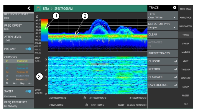 1. Color Bar settings are used to adjust the colors displayed at different amplitude levels. The color bar shown here represents the range of colors that will be displayed. This bar can be dragged up or down to adjust the coverage area. If signals or noise is outside of the color bar range, then black is displayed. The color bar top and bottom setting, and the overall hue to the color range is set via the SETUP Menu. 2. The traces shown in Spectrogram view are updated when the data in the spectrogram lands on the associated cursor. The traces show sweep data from that respective point in time. The bandwidth and amplitude settings in the example above were changed. Traces 1 through 3 reflect the changed settings while traces 4 through 6 are showing sweep data from earlier points in time. To freeze the spectrogram, stop the instrument from sweeping by toggling off Sweep Continuously. 3. The spectrogram START and STOP times shown here represent the full duration of all 142 sweeps shown in the spectrogram window. Cursors 1 through 6 are positioned throughout the spectrogram and can be dragged or set to a new time or position using the TRACE CURSOR Menu. Cursors can also be selected via the left side status menu CURSORS table. The bottom of the table shows the reference trace (T0) and its settings. The reference trace setting apply to all traces shown in the spectrum display. |