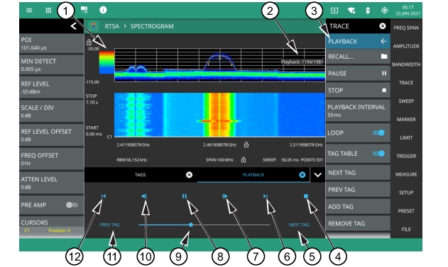 1. Recorded trace and spectrum waterfall. 2. Shows either the Recording or Playback indicator. 4. Stops the current trace playback session and restores live data display from the RF input. 5. Steps to the next tagged trace in the recorded session. Untagged traces will be skipped. 6. Increments the trace index by 142 to the next set of spectrogram traces. 7. Increments the trace index by 1 to the next trace in the sequence. | 8. Starts playback of the selected trace recording. During playback, the button changes to the PAUSE button, allowing pausing of the playback. 9. Playback location indicator/slider - can be used to drag playback forward and backward. 10. Decrements the trace index by 1 to the previous trace in the sequence. 11. Steps to the previous tagged trace in the recorded session. Untagged traces will be skipped. 12. Decrements the trace index by 142 to the previous set of spectrogram traces. |