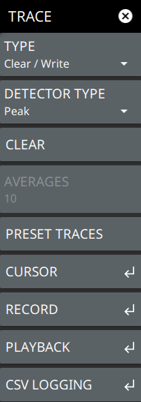 CLEAR Clears the currently active trace data. AVERAGES Sets the number of trace sweeps (N) to average. Available when the trace type is set to one of the averaging modes. PRESET TRACES Presets cursor and trace setup to Clear/Write, Active, with Peak Detector. CURSOR Opens the TRACE CURSOR Menu. RECORD Opens the TRACE RECORD Menu. PLAYBACK Opens the TRACE PLAYBACK Menu. CSV LOGGING Opens the TRACE CSV LOGGING Menu. |