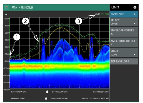 1. Limit points are shown as gray circles. The active point is filled in gray. Points can be dragged into position or set discretely using the frequency and amplitude settings in the LIMIT EDIT Menu. 2. The limit line shown here is an upper envelope limit line. The limit line color is green when the trace does not cross the limit line, and the limit line color turns red when the trace crosses it. 3. The limit test pass/fail status is also shown in green or red color at the top of the display. The limit test is applied to the active trace, indicated here by T1. |