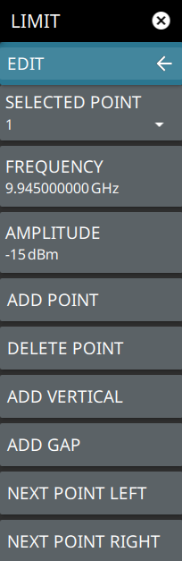 SELECTED POINT: Displays the limit line point number. Press to select a different point from the displayed list. FREQUENCY: Sets the frequency of a limit line inflection point. The frequency of each point in a limit line can be individually set. When a new point is added, it takes the value that is halfway between two existing points, or it takes the stop frequency of the current sweep if no point is higher in frequency than the one being added. See the ADD POINT button description for more details. Use the keypad or the left and right arrow keys to change the frequency of an inflection point. The left or right arrows move the inflection point by ±0.1. Up or down arrows move the inflection point ±1. AMPLITUDE: Sets the amplitude of a limit line inflection point. The amplitude of each inflection point can also be individually set. By default, when a new point is added it takes the amplitude value that is on the limit line at the frequency where the point was added. Use the keypad (using +/- to set a negative value) or the plus (+) or minus (–) control to increment the value. The unit of the amplitude limit is the same as the current vertical amplitude unit (for example, dBm). ADD POINT: Press this button to add a limit line inflection point. The precise behavior of this button depends upon which inflection point is active at the time that the button is pressed. If the active limit point is somewhere in the middle of a multi-segment limit line, then a new limit point is added that is halfway between the currently active point and the point immediately to its right. The amplitude of the inflection point will be such that it falls on the limit line. For example, if a limit point exists at 2.0 GHz with an amplitude of –30 dBm, and if the next point is 3.0 GHz with an amplitude of –50 dBm, then the added point will be at 2.5 GHz with an amplitude of –40 dBm. If the last limit point is active (assuming it is not at the right edge of the display), then the new limit point will be placed at the right edge of the display at the same amplitude as the point immediately to its left. Points may not be added beyond the current sweep limits of the instrument. Use the FREQUENCY and AMPLITUDE buttons to make adjustments to the selected point. DELETE POINT: Press this button to delete the selected point. ADD VERTICAL: Press this button to add an inflection point below the currently selected point. ADD GAP: Select this button to disconnect the continuous limit line. It can be used when you don’t want to apply limit to a specific portion of the trace. NEXT POINT LEFT: Press this button to select the inflection point that is immediately to the left of the active point, making this newly selected point active for editing or deletion. With each button press, the active point becomes that point to the left of the previously active point, until the newly selected active point becomes the left-most point on the screen. NEXT POINT RIGHT: Press this button to select the limit point immediately to the right of the active point, making this newly selected point active for editing or deletion. With each button press, the active point becomes that point to the right of the previously active point, until the newly selected active point becomes the right-most point on the screen. |