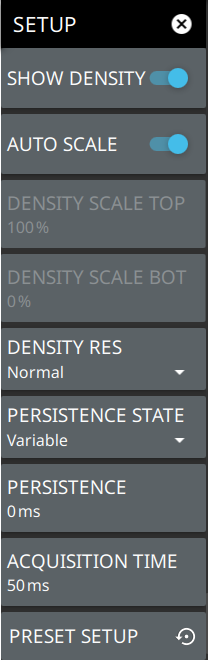![]() | SHOW DENSITY Toggles the density display on or off. Density displays the relative time density of a signal in a color scale ranging from blue to red. Signals that persist longer or more often during the acquisition time are indicated in red color. Brief transient signals are shown in blue color. AUTOSCALE When toggled on, automatically adjusts the DENSITY SCALE TOP and DENSITY SCALE BOT settings of the density display based on the amplitude of the signal. DENSITY SCALE TOP Sets the percentage of signal time for the top (red) density scale. DENSITY SCALE BOT Sets the percentage of signal time for the bottom (blue) density scale. Any signal that appears at a rate lower than the DENSITY SCALE BOT setting will not appear in the density plot. DENSITY RES Density resolution sets the FFT size of the RTSA capture. Normal resolution sets a 512 point FFT; High resolution sets a 1024 point FFT. Higher resolution gives finer frequency detail to the density display, but increases POI. Lower resolution will result in a lower POI, but gives less frequency detail to the density display. PERSISTENCE STATE Toggles the persistence state between Variable or Infinite. Infinite persistence means the density plot will not fade away after a signal is no longer present. It is useful for seeing very fast and infrequent signals. Variable persistence sets a user defined time for the density colors to fade. Longer persistence values can be used to best illustrate the signals being observed. PERSISTENCE Sets the decay time of the density display. ACQUISITION TIME The acquisition time sets the update interval for each spectrum trace, spectrogram line, and density display. During the acquisition interval, spectral data from multiple FFTs of the input signal are taken and combined. The acquisition time is adjustable to allow resolving multiple, brief signal events in time and to observe longer term behaviors. PRESET SETUP Presets the color setup settings. |