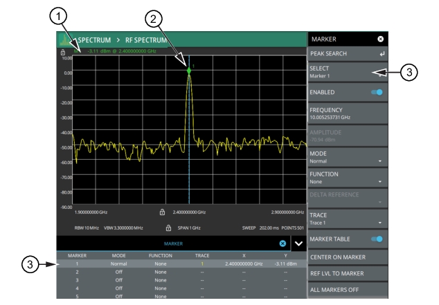 1. RF Spectrum view marker information display. 2. Marker located on trace. The active marker is indicated with solid green fill, other markers will show with a hollow fill, fixed markers show as a green X. The dashed vertical line is attached to the active marker and facilitates touch operations. Either the marker or the line can be dragged into position, and either can be double tapped to open a number of peak search options. 3. Selected marker in the MARKER menu and in the MARKER table. The marker table shows all of the marker parameters and measurement values. You can edit marker parameters from the marker table as well as from the MARKER menu. |