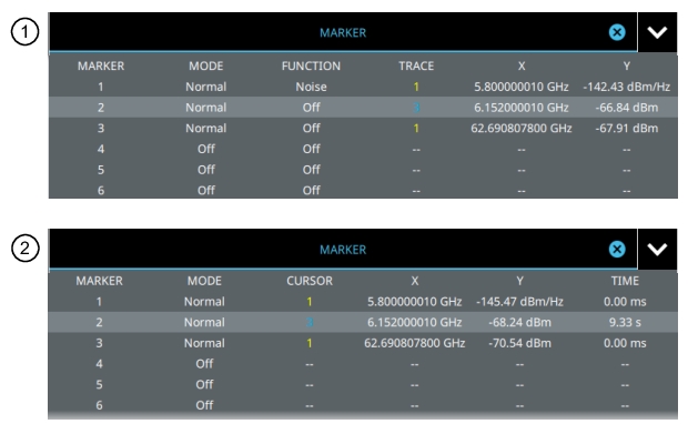 ![]() | PEAK SEARCH Opens the MARKER PEAK SEARCH. SELECT Turns on the selected marker if it is off or makes it the active marker if it is already turned on. Selecting the MARKER menu button for the first time will turn on Marker 1 as a normal marker at the center frequency, and open the MARKER menu. Selecting the MARKER menu button thereafter opens the MARKER menu to the current active marker, which is displayed in the upper left-hand corner of the screen. When a marker is turned on, it is a normal marker positioned at the center frequency of the selected trace. ENABLED: Enables the selected marker. When the toggle is off, the marker is disabled and not shown on the screen. FREQUENCY Displays the marker frequency. For delta markers, the frequency is relative to the reference marker. Change the marker frequency by dragging it to the desired location. You can also change the marker frequency by pressing the FREQUENCY button and changing it manually using the keypad controls. AMPLITUDE Displays the current marker amplitude. When the marker mode is set to Normal or Delta, the amplitude is set by the trace. In that case, the amplitude is not settable by the user. The button is grayed out, but the value is still updating with every sweep. If the marker is a Fixed marker, the amplitude value can be changed by dragging the marker to the desired location or by directly entering the amplitude using the keypad control. MODE Select marker preference: • Normal: A Normal marker is also known as a tracking marker. The frequency is fixed but the amplitude value varies from sweep to sweep. • Delta (Δ): A Delta (Δ) marker displays the delta frequency and amplitude between itself and a reference marker. If Marker 1 is selected to be a Delta marker, then Marker 2 is turned on as a reference marker for Marker 1 and it becomes a Normal marker at the same location. The reference marker can then be switched to a Fixed marker if desired. • Fixed: A Fixed marker has a fixed amplitude and fixed frequency, which are defined by the user and not related to the trace or sweep data. FUNCTION Sets the function of the currently selected marker to None, Noise, Frequency Counter, or Quasi-Peak. For more information about using marker functions, refer to Marker Functions. COUNTER RESOLUTION Available when the marker function is set to Frequency Counter. This setting adjusts the frequency counter marker resolution to 1 Hz, 100 mHz, 10 mHz, or 1 mHz. Lower resolutions will result in greater peak accuracy, but a slower sweep. |