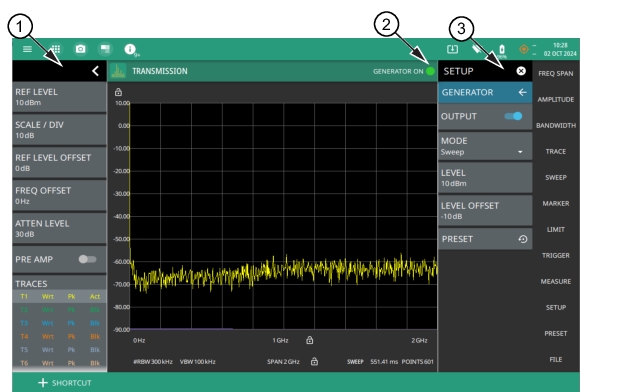 1. The status panel provides quick access to common spectrum analyzer settings. See STATUS PANEL (Transmission). 2. The GENERATOR ON indicator appears on the top right, when the OUTPUT toggle is turned on. The green light indicates that the generator is on. Touch the indicator to open the GENERATOR submenu. Refer to GENERATOR Menu (Option 20) for details. 3. The setup menu is used to set transmission measurement parameters. See SETUP Menu (Transmission). |