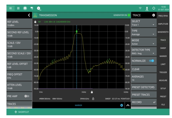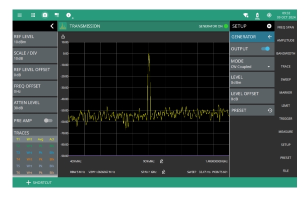 1. The status panel provides quick access to common spectrum analyzer settings. See STATUS PANEL (Transmission). 2. The GENERATOR ON appears on the top right, when the OUTPUT toggle is turned on. The green light indicates that the tracking generator or CW generator is on. 3. The setup menu is used to set transmission measurement parameters. See SETUP Menu (Transmission). Note that touching GENERATOR ON indicator will bring up the GENERATOR submenu. Refer to GENERATOR Menu (Option 20) for details. |