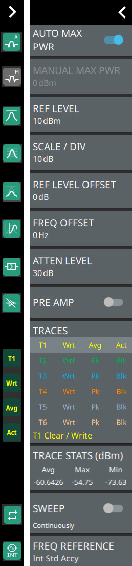 ![]() | AUTO MAX PWR Toggle auto maximum power to set the maximum power automatically. MANUAL MAX PWR Enables when Auto Max Power is toggled. REF LEVEL Sets the reference level of the top graticule line in the selected units. If the reference level offset is not zero, OFFSET REF LEVEL is displayed at this location. Refer to Setting Amplitude Parameters. SCALE/DIV Sets the graticule scale/division for log-based units. This setting does not apply to linear units. REF LEVEL OFFSET Sets the reference level offset in dB units. This setting can compensate for the presence of external input attenuation or gain. FREQ OFFSET Accounts for frequency conversions outside of the analyzer. Refer to Setting Frequency Parameters. ATTEN LEVEL When auto attenuation is off, sets input attenuation. PRE AMP Toggles the low-noise front-end preamplifier on or off. Refer to Setting Amplitude Parameters. TRACES/CURSORS Displays the current status of up to six traces or cursors in a quick-view summary. When the measurement view is set to RF Spectrum, trace information is displayed in this area. When the measurement view is set to Spectrogram, cursor information is displayed in this area. Cursors are available in the Spectrum measurement with the Spectrogram view selected. The summary information includes the trace or cursor number, type, mode, and detector type. The active trace will show a highlighted background with the mode and detector type restated under the table. In Spectrogram, a reference trace (T0) will show you the settings of the trace used to fill the spectrogram. The reference trace settings are applied to all traces and cursors while in Spectrogram view. Selecting a trace or cursor in the summary panel activates the pressed trace or cursor and opens the TRACE menu, allowing you to select and set up an individual trace or cursor as desired. Refer to Setting Trace Parameters. TRACE STATS (dBm) Displays the spectrum analyzer received Maximum, Average, and Minimum power of each frequency range sweep. SWEEP Toggles the current sweep setting between continuously or sweep once. Refer to Setting Sweep Parameters. FREQ REFERENCE Indicates the current frequency reference source of Internal High Accuracy (used after GPS has lost sync, but while the internal clock still has good GPS reference), Internal Standard Accuracy, External, or GNSS (GPS) Hi Accy (requires GPS). The instrument automatically selects the frequency reference in the following order of priority: external, GPS, then the internal time base. | |