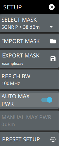 ![]() | SELECT MASK Selects the desired upper or lower emission mask. Choose the desired mask from the list. IMPORT MASK Used to import a custom user mask. EXPORT MASK Exports an example user mask as a comma separated value file (see Example Custom Signal Emission Mask) or exports the currently selected custom mask. REF CH BW Sets the reference channel bandwidth for the measurement. AUTO MAX PWR Toggles automatic max power. Some segments in the mask are dependent on the main channel power. Enabling this automatically calculates the reference channel power by measuring the channel power of the center channel bandwidth. When disabled, the reference power must be entered manually below. MANUAL MAX PWR Used to manually enter the reference channel power for masks that have limits dependent on main channel power. PRESET SETUP Presets all values on the SETUP menu to default values. |