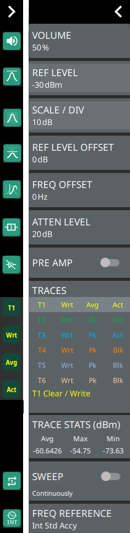 VOLUME Sets the volume level for the audio response of the measurement. Note that the system volume can affect the range of this setting. REF LEVEL Sets the reference level of the top graticule line in the selected units. If the reference level offset is not zero, OFFSET REF LEVEL is displayed at this location. Refer to Setting Amplitude Parameters. SCALE/DIV Sets the graticule scale/division for log-based units. This setting does not apply to linear units. REF LEVEL OFFSET Sets the reference level offset in dB units. This setting can compensate for the presence of external input attenuation or gain. FREQ OFFSET Accounts for frequency conversions outside of the analyzer. Refer to Setting Frequency Parameters. ATTEN LEVEL When auto attenuation is off, sets input attenuation. PRE AMP Toggles the low-noise front-end preamplifier on or off. Refer to Setting Amplitude Parameters. TRACES/CURSORS Displays the current status of up to six traces or cursors in a quick-view summary. When the measurement view is set to RF Spectrum, trace information is displayed in this area. When the measurement view is set to Spectrogram, cursor information is displayed in this area. Cursors are available in the Spectrum measurement with the Spectrogram view selected. The summary information includes the trace or cursor number, type, mode, and detector type. The active trace will show a highlighted background with the mode and detector type restated under the table. In Spectrogram, a reference trace (T0) will show you the settings of the trace used to fill the spectrogram. The reference trace settings are applied to all traces and cursors while in Spectrogram view. Selecting a trace or cursor in the summary panel activates the pressed trace or cursor and opens the TRACE menu, allowing you to select and set up an individual trace or cursor as desired. Refer to Setting Trace Parameters. TRACE STATS (dBm) Displays the spectrum analyzer received Maximum, Average, and Minimum power of each frequency range sweep. SWEEP Toggles the current sweep setting between continuously or sweep once. Refer to Setting Sweep Parameters. FREQ REFERENCE Indicates the current frequency reference source of Internal High Accuracy (used after GPS has lost sync, but while the internal clock still has good GPS reference), Internal Standard Accuracy, External, or GNSS (GPS) Hi Accy (requires GPS). The instrument automatically selects the frequency reference in the following order of priority: external, GPS, then the internal time base. | ||