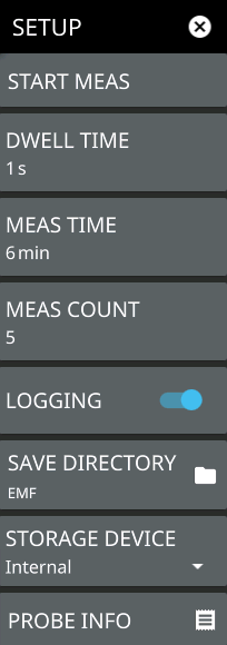 ![]() | START MEAS Initiates an EMF measurement. Once the measurement is started, all UI interface is locked until the measurement is complete. A pop-up control appears that allows you to immediately stop the measurement. Note that a valid antenna must be connected and a supported frequency range must be set before a measurement can be started. Note that the START MEAS button also appears on the MEASURE menu and provides the same functionality. DWELL TIME Specifies the time to sweep on each of the three isotropic antenna axis (X, Y, and Z). The sweeps are then averaged and saved for further computation. Note that if the sweep time is longer than the dwell time setting, the sweep time will determine the time spent on each axis (a complete sweep must be completed before moving to the next axis). MEAS TIME Sets the duration of each EMF measurement from one minute up to 30 minutes. The default is 6 minutes. The measurement time includes all of the sweeps for each axis, which repeats until the total measurement time is completed. For example, if the axis dwell time is set to 1 second (and the sweep time is 1 second or less) and the measurement time is set to 1 minute, you will get one complete isotropic result after 3 seconds, and approximately 20 isotropic results at the end of the one-minute measurement. The CURRENT row in the summary table at the bottom of the screen displays a running average of the isotropic results, and the max and min of the computed total integrated power of the isotropic results every 3 s. The displayed values are computed from all measurements completed thus far within the measurement time. At the end of the measurement time, the CURRENT row is cleared and the TOTAL row is updated with the max, min, and running average of all isotropic results (20 in this example). MEAS COUNT Sets the number of EMF measurements (set in MEAS TIME) to complete from 1 up to 10,000. The EMF test is fully executed when the specified number of measurements have completed. LOGGING Logging is toggled on by default. This must be selected prior to starting the EMF measurement for the results to be logged. Each log file can hold 21 measurements for a maximum of 10,000 measurements total. All files for a measurement run will be stored in the same folder with the year, month, day, measurement time and number. SAVE DIRECTORY Sets the directory of where the log folders are created. STORAGE DEVICE Sets the storage location of either Internal memory or an externally connected storage device. PROBE INFO Displays the details of the connected isotropic antenna, for e.g. frequency range, hardware revision etc. |